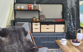 – Küche mit 230 V Anschluß, Dometic Kühlbox, Spülbecken und Gasherd
